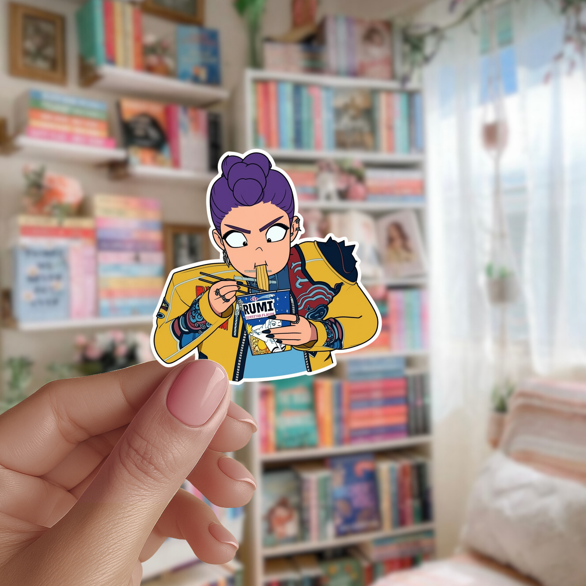 Maak kennis met Rumi van Huntrix (Kpop Demon Hunters) 🍜✨, vastgelegd op deze leuke gestanste vinylsticker. Perfect voor Kpop-fans die van unieke personages en verzamelbare stationery houden.